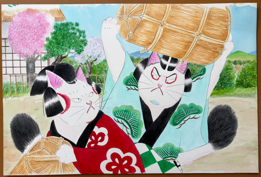 「賀の祝〜菅原伝授手習鑑 」「かぶきがわかるねこづくし絵本3 菅原伝授手習鑑 (講談社)」より