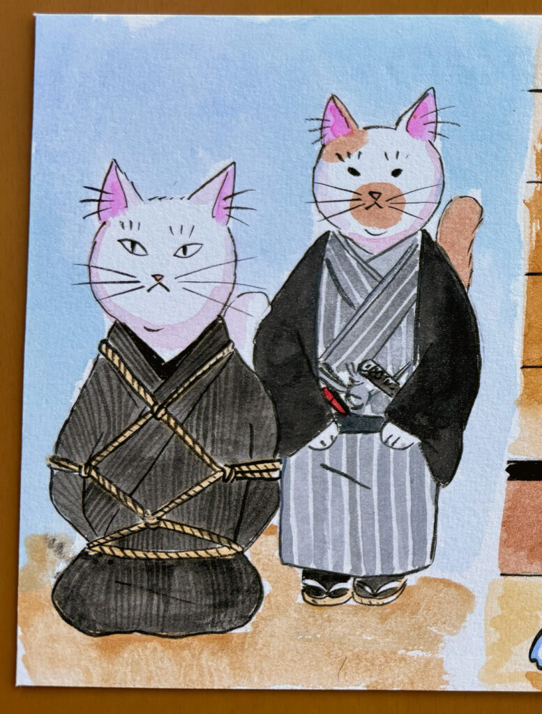といってラストの奉行所裏手の場面ばかり描くのも片手落ちになるので、奉行所の場面として縄にかかった幸蔵と、成り行きを見守る早瀬弥十郎のカットを配置しました。