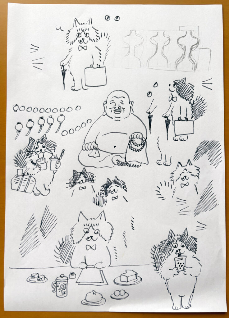 レポートの机に並んでいるのは左からタロ芋団子、パイナップルケーキ、台湾茶、台湾カステラ、肉まんです。