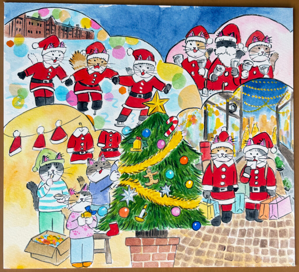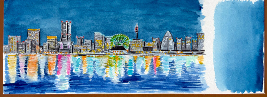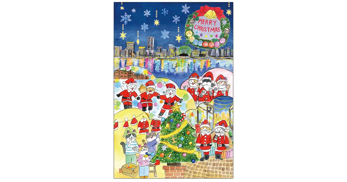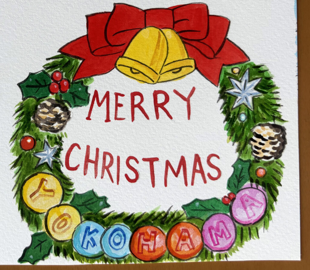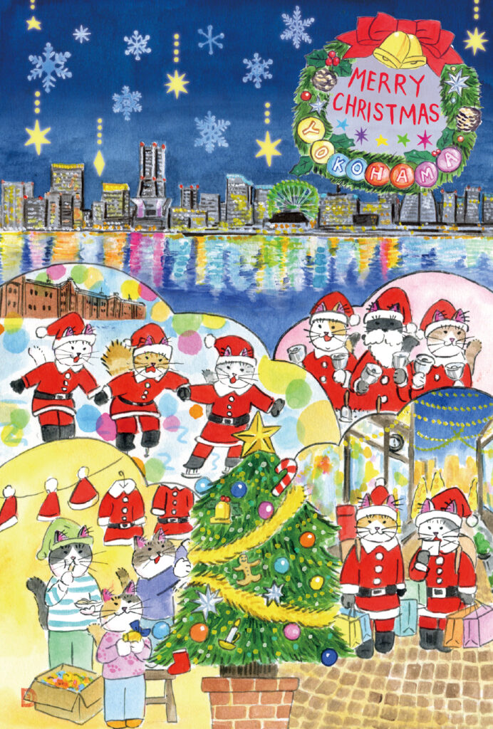 COPC84 クリスマスの横浜 ご当地シリーズ 2025.12.24 絵の解説 キラキラ眩しい夜景は山下公園からの眺め。 ハンド・ベルでクリスマス気分を高め、赤レンガ倉庫でスケートを楽しんで、元町商店街でお買い物 クリスマス・ツリーの飾り付けをしてシュトーレンをつまみ食い 静かにふけゆく師走の夜。